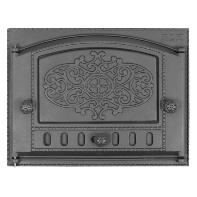 Растительный орнамент на чугунной вставке каминной дверки серии ДК-2Б станет не только украшением вашей печи, но и будет выполнять функцию рёбер жёсткости, предотвращая коробление конструкции дверки под воздействием высоких температур.