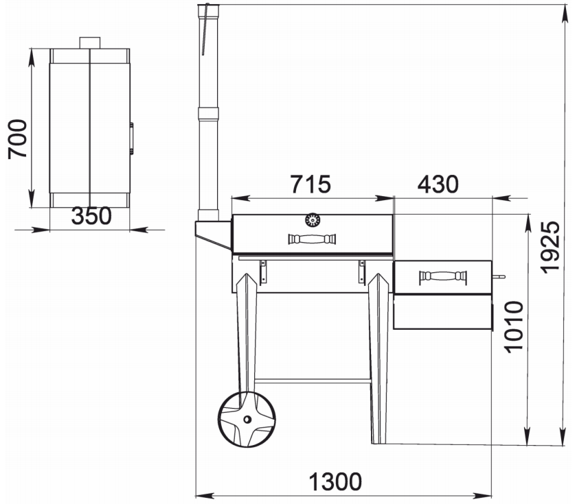 Все узлы смокера выполнены из 3-х миллиметровой высококачественной стали. Общий вес установки составляет более 100 кг.