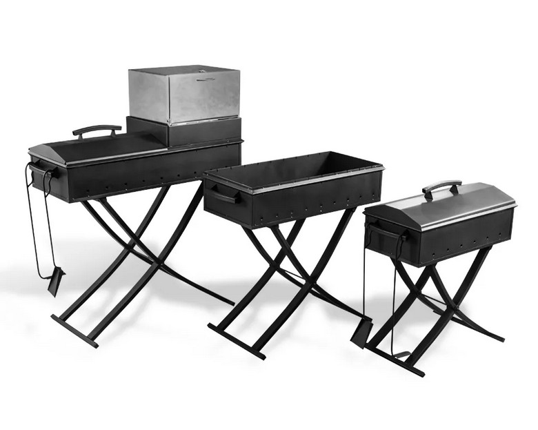 Мангал состоит из «коробки» и съемных опор (ножек), которые легко устанавливаются и снимаются. Очень надежный без излишеств вариант для любителей практичных вещей.