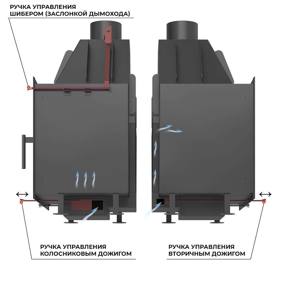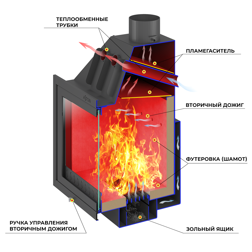 Большое стекло для наблюдения за процессом горения.