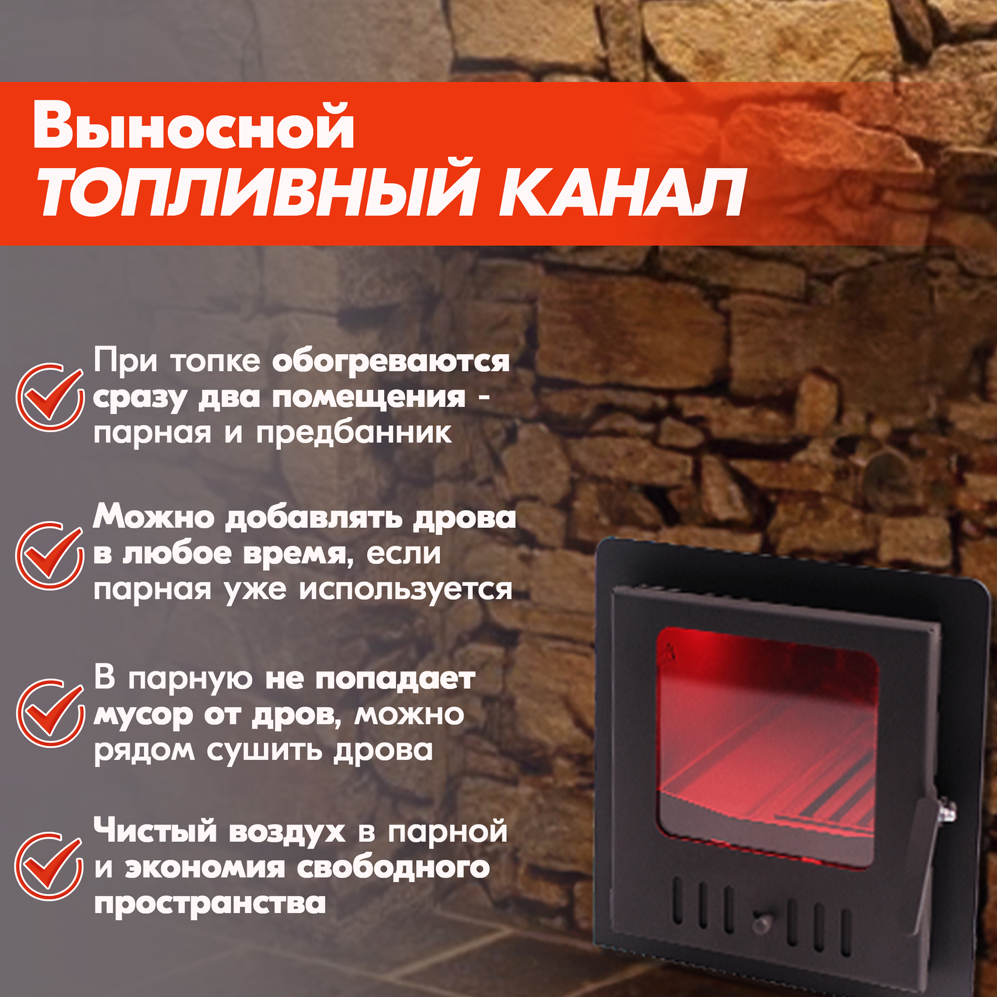 Благодаря выносному топливному каналу дровяной печи: