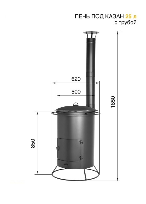 Печь под казан с трубой большая предназначена для приготовления пищи под открытым небом, благодаря тому, что печь под казан имеет высокую вытяжную трубу самоварного типа. Дым, выходящий из трубы, не мешает окружающим. Колосниковая решётка, выполненная из чугуна, выдвижным зольным ящиком позволяет удалить золу при работающей печи. Так же выдвижной зольный ящик дает возможность регулировать интенсивность горения дров в топке.