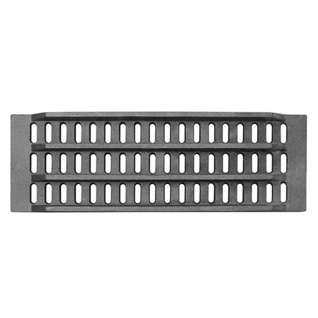 Решетка колосниковая промышленная РУ-П-5 предназначена для топки углем. Решетки колосниковые выполняются цельными из чугуна. В решетках имеются отверстия, через которые подается воздух к топливу и просыпается зола в поддувало. Решетка используется для размещения и просушивания топлива. Важной функцией решетки колосниковой РУ-П-5 является то, что она производит распределение потока воздуха из отделения для золы и обеспечивает качественную тягу. В комплексе с дверцей  это позволяет осуществлять контроль и регулировку пламени. Что касается площади просветов, то хороший чугунный колосник РУ-П-5 должен иметь величину данного показателя в пределах 40 %. А вот снижение площади просвета может привести к недостаточно полному сгоранию топлива и повышению образования газов. Постоянное воздействие высоких температур, одновременно охлаждение снизу и механические нагрузки является серьезным испытанием на прочность. Поэтому чугун должен быть высокого качества.