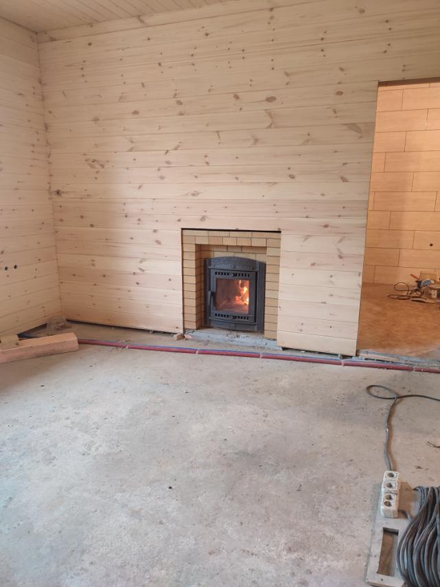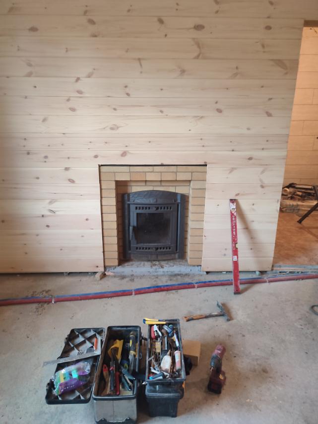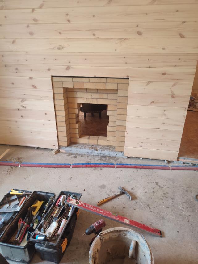 Монтаж печи Атмосфера с установкой коплекта дымохода и кирпичного портала.
